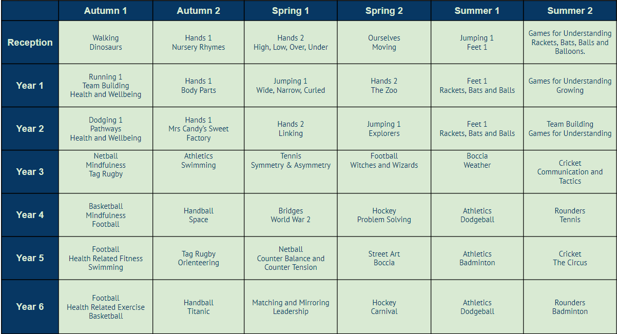 We use the units of work which include videos, resource cards and information to ensure the safety of all when taking part, covering all areas of the Physical Education National Curriculum for EYFS, KS1 and KS2, with transition units available to bridge the gaps into KS3 but than can be used for challenge and variety.
